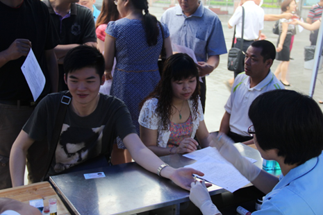 5月20日早上8点多,天上还下着大雨,各志愿参加无偿献血的人员已陆续来到明富昌体育馆门前篮球场旁的献血现场。他们有说有笑,为自己能对社会做一点力所能及的事感到自豪,也用嫣然笑语冲淡献血前的紧张情绪。同时,三水血站的工作人员及志愿者们也在忙碌着搭帐篷、搬桌子、凳子,准备着献血的有关事宜。接着,在血站工作人员的指引下,献血人员开始填表、测血压、扎手指化验血样,整个过程始终都在一种轻松、愉快的氛围中有序进行。通过体检的人员快步走上采血车,在粗大的针头面前,都毫不畏惧地露出了胳膊,通过细小的导管,鲜红的热血充满了一个个的血袋。