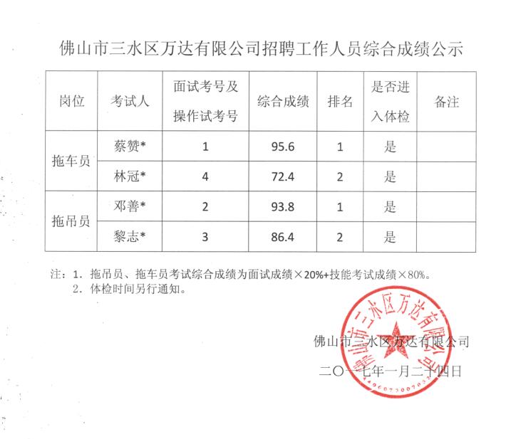 佛山市三水区万达有限公司招聘拖吊员及拖车员综合成绩公示