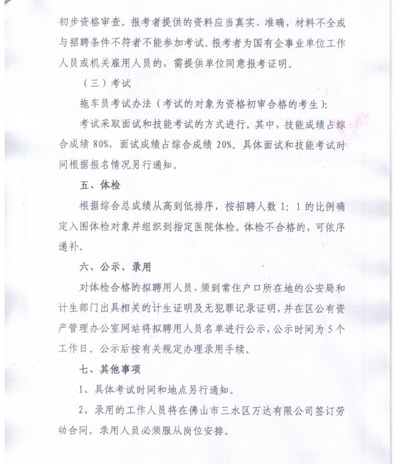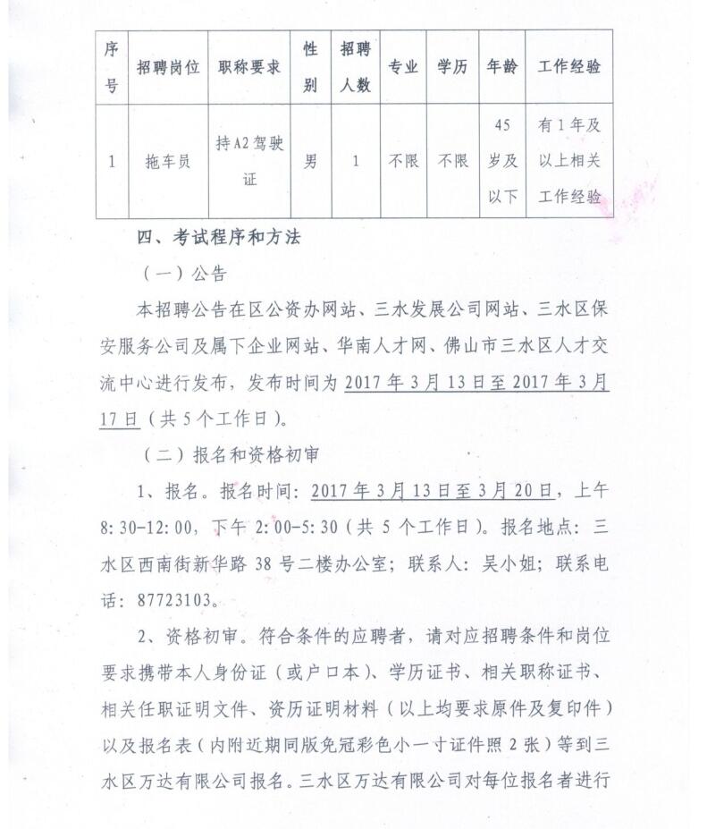 佛山市三水区万达有限公司拖车员招聘公告