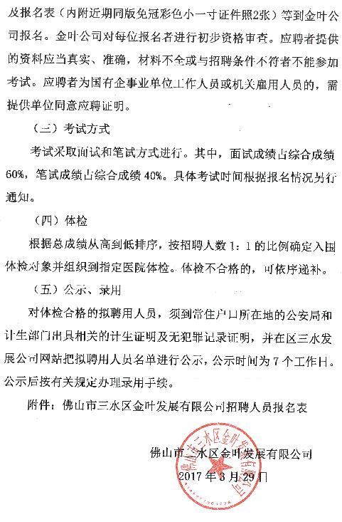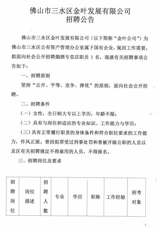 佛山市三水区金叶发展有限公司招聘公告
