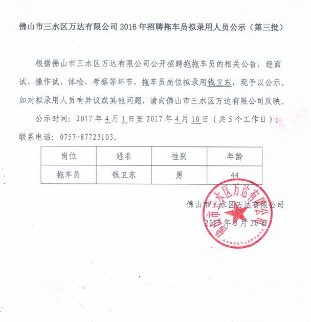 佛山市三水区万达有限公司2016年招聘拖车员及拖吊员拟录用人员公示(第三批)