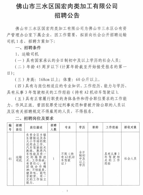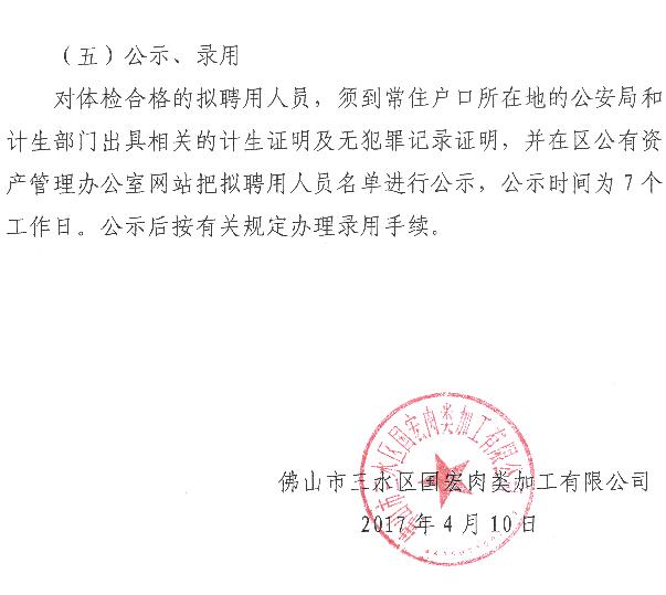 佛山市三水区国宏肉类加工有限公司招聘公告