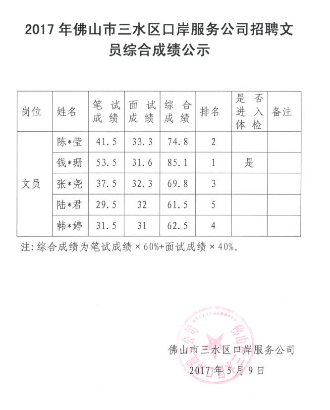 2017年佛山市三水区口岸服务公司招聘文员综合成绩公示