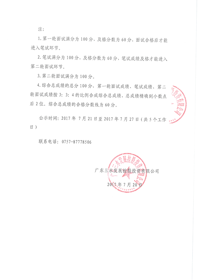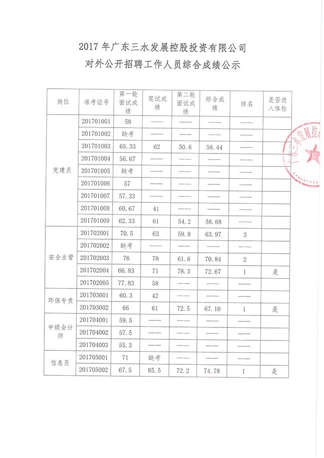 2017年广东球盟会qmh控股投资有限公司对外公开招聘工作人员综合成绩公示