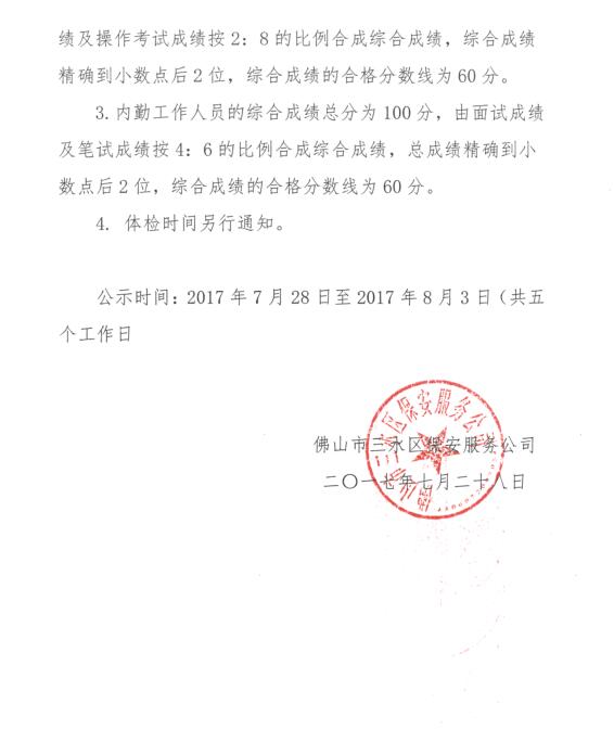 2017年佛山市三水区保安服务公司及属下企业对外公开招聘工作人员综合成绩公示
