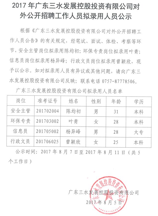 2017年广东球盟会qmh控股投资有限公司对外公开招聘工作人员拟录用人员公示