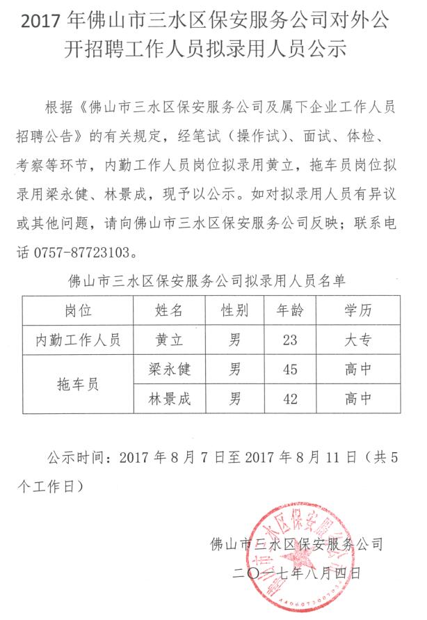 2017年佛山市三水区保安服务公司对外公开招聘工作人员拟录用人员公示