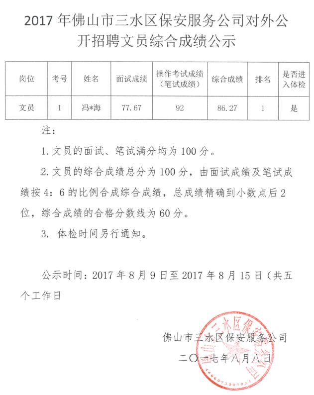 2017年佛山市三水区保安服务公司对外公开招聘文员综合成绩公示