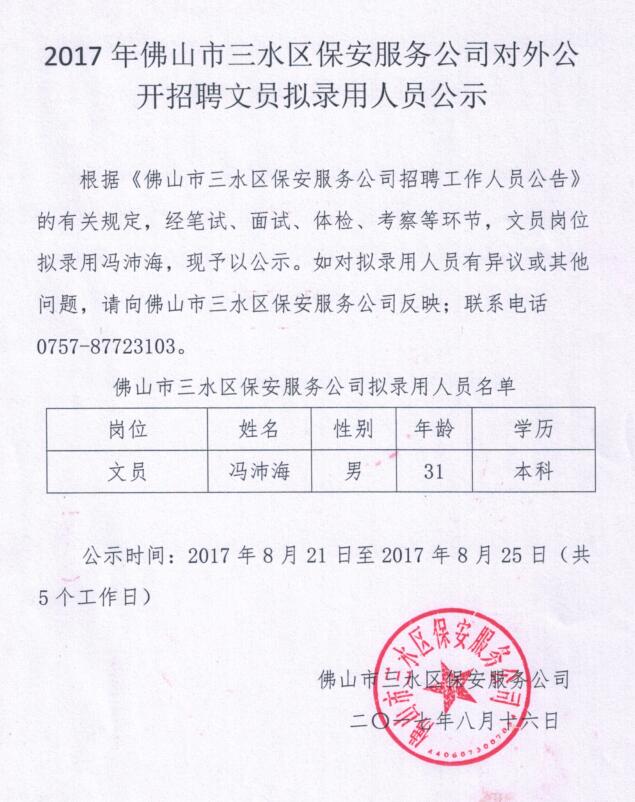 2017年佛山市三水区保安服务公司对外公开招聘文员拟录用人员公示