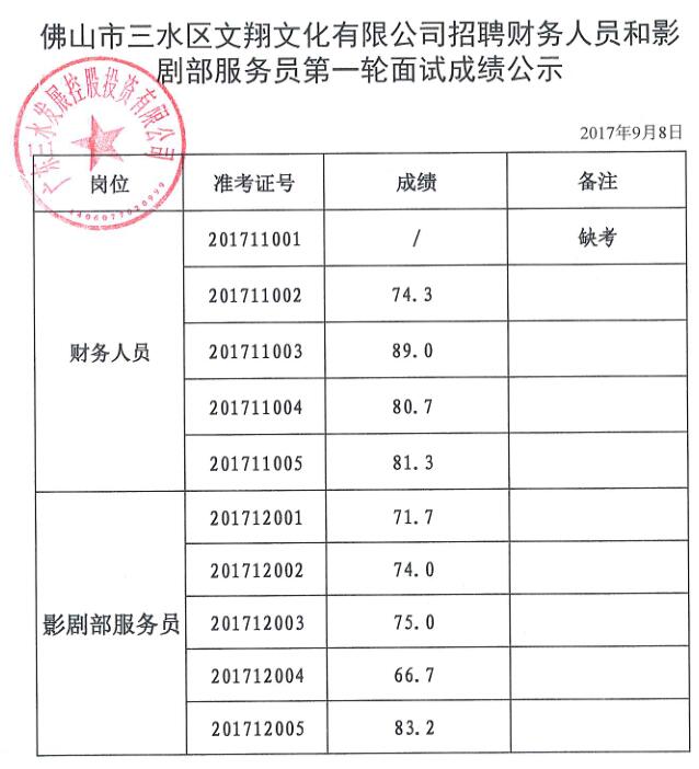 佛山市三水区文翔文化有限公司招聘财务人员和影剧部服务员第一轮面试成绩公示
