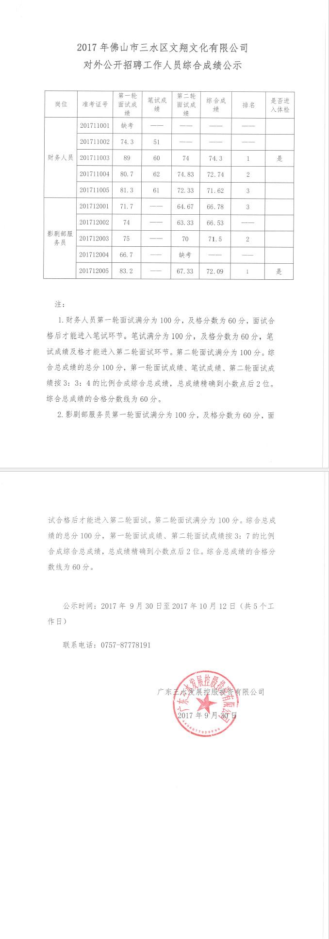 2017年佛山市三水区文翔文化有限公司对外公开招聘工作人员综合成绩公示