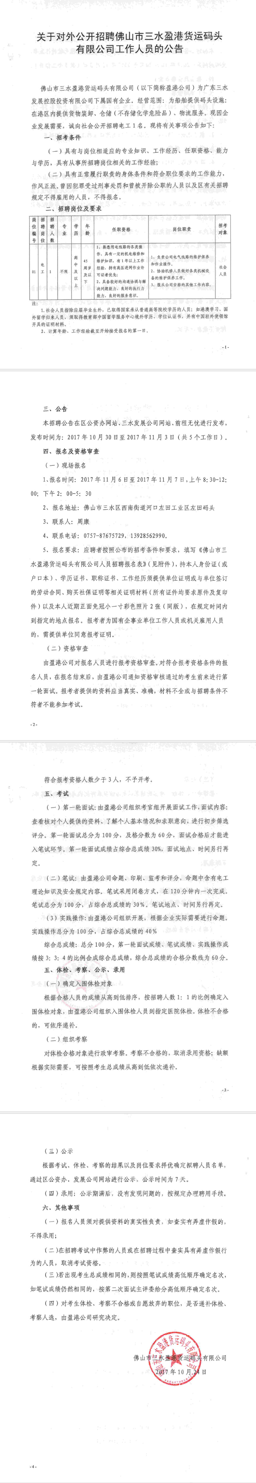关于对外公开招聘佛山市三水盈港货运码头有限公司工作人员的公告