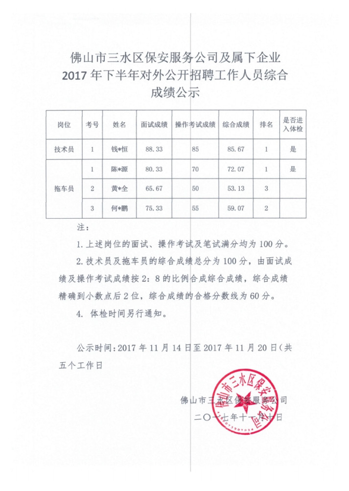 佛山市三水区保安服务公司及属下企业2017年下半年对外公开招聘工作人员综合成绩公示