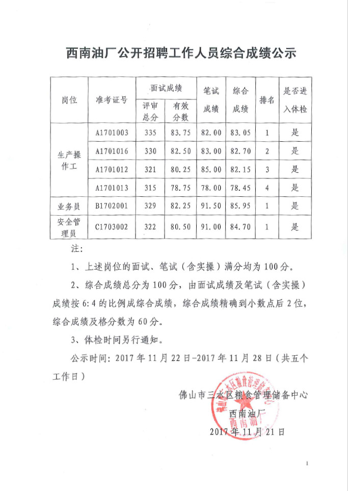 西南油厂公开招聘工作人员综合成绩公示