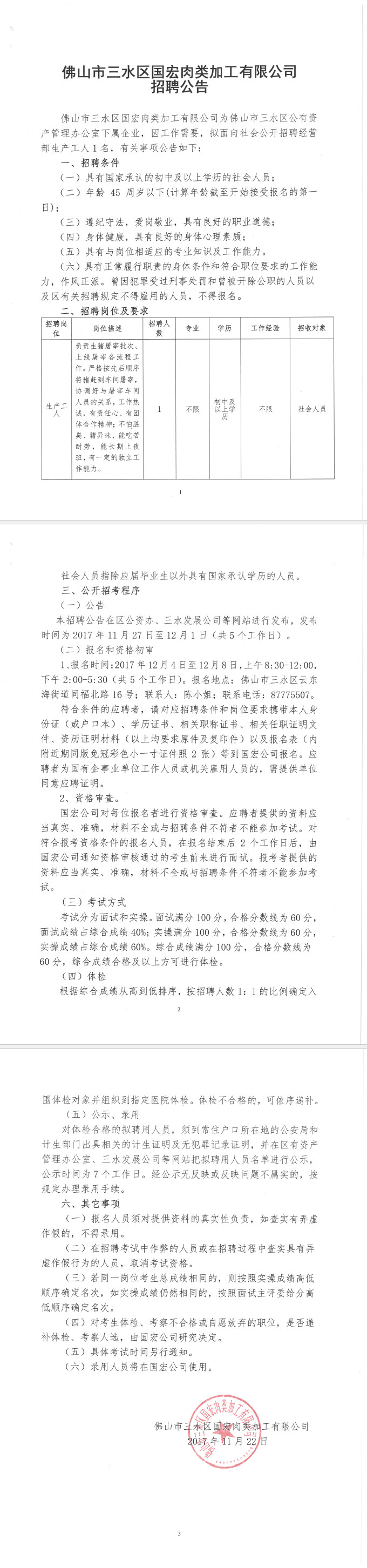 佛山市三水区国宏肉类加工有限公司招聘公告(国宏公司生产工)