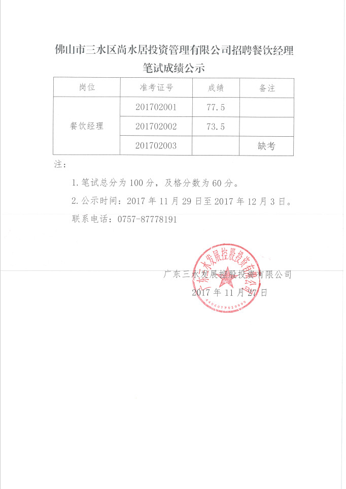 佛山市三水区尚水居投资管理有限公司公开招聘餐饮经理笔试成绩公示