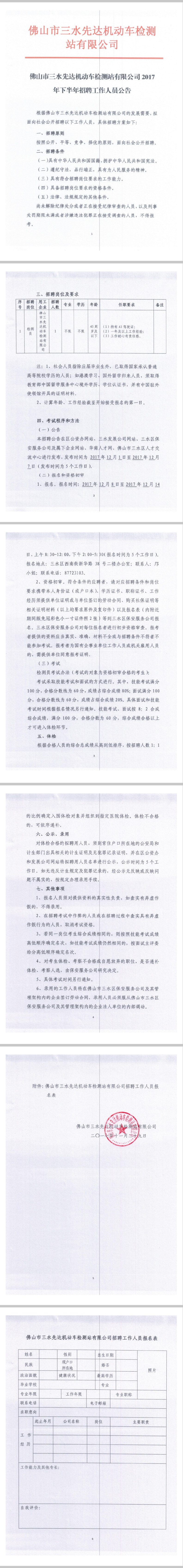 佛山市三水先达机动车检测站公司2017年下半年招聘工作人员公告