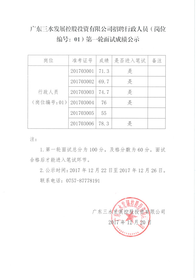 广东球盟会qmh控股投资有限公司招聘行政人员(岗位编号:01)第一轮面试成绩公示
