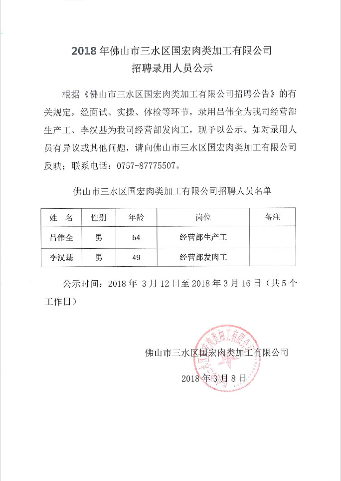 2018年佛山市三水区国宏肉类加工有限公司招聘录用人员公示