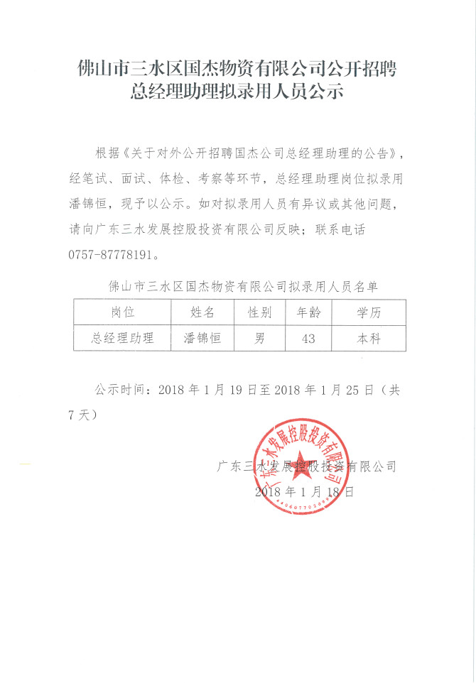 佛山市三水区国杰物资有限公司公开招聘总经理助理拟录用人员公示