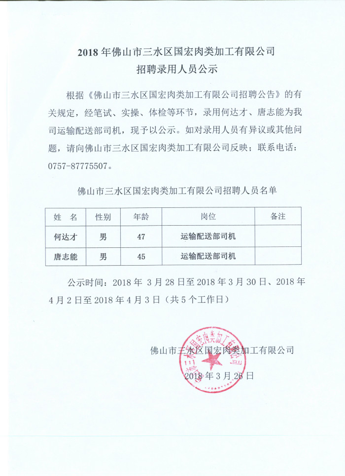 2018年佛山市三水区国宏肉类加工有限公司招聘录用人员公示