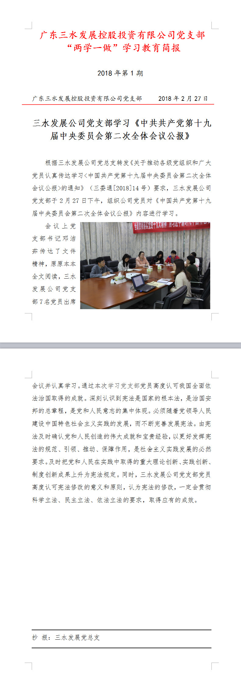 球盟会qmh公司“两学一做”学习教育简报第1期——学习《中共共产党第十九届中央委员会第二次全体会议公报》