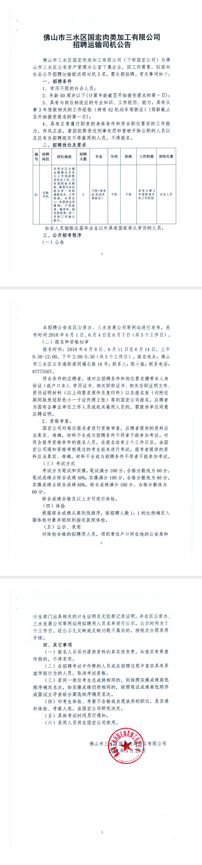 佛山市三水区国宏肉类加工有限公司招聘运输司机公告