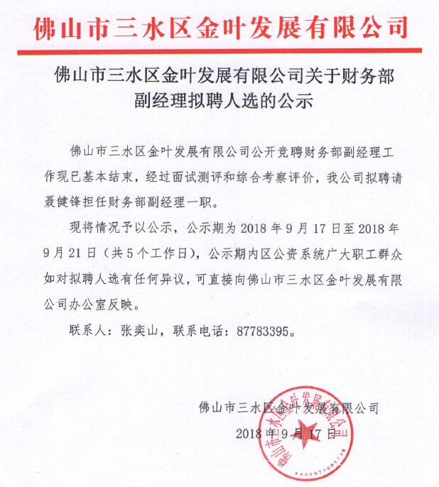 佛山市三水区金叶发展有限公司关于财务部副经理拟聘人选的公示