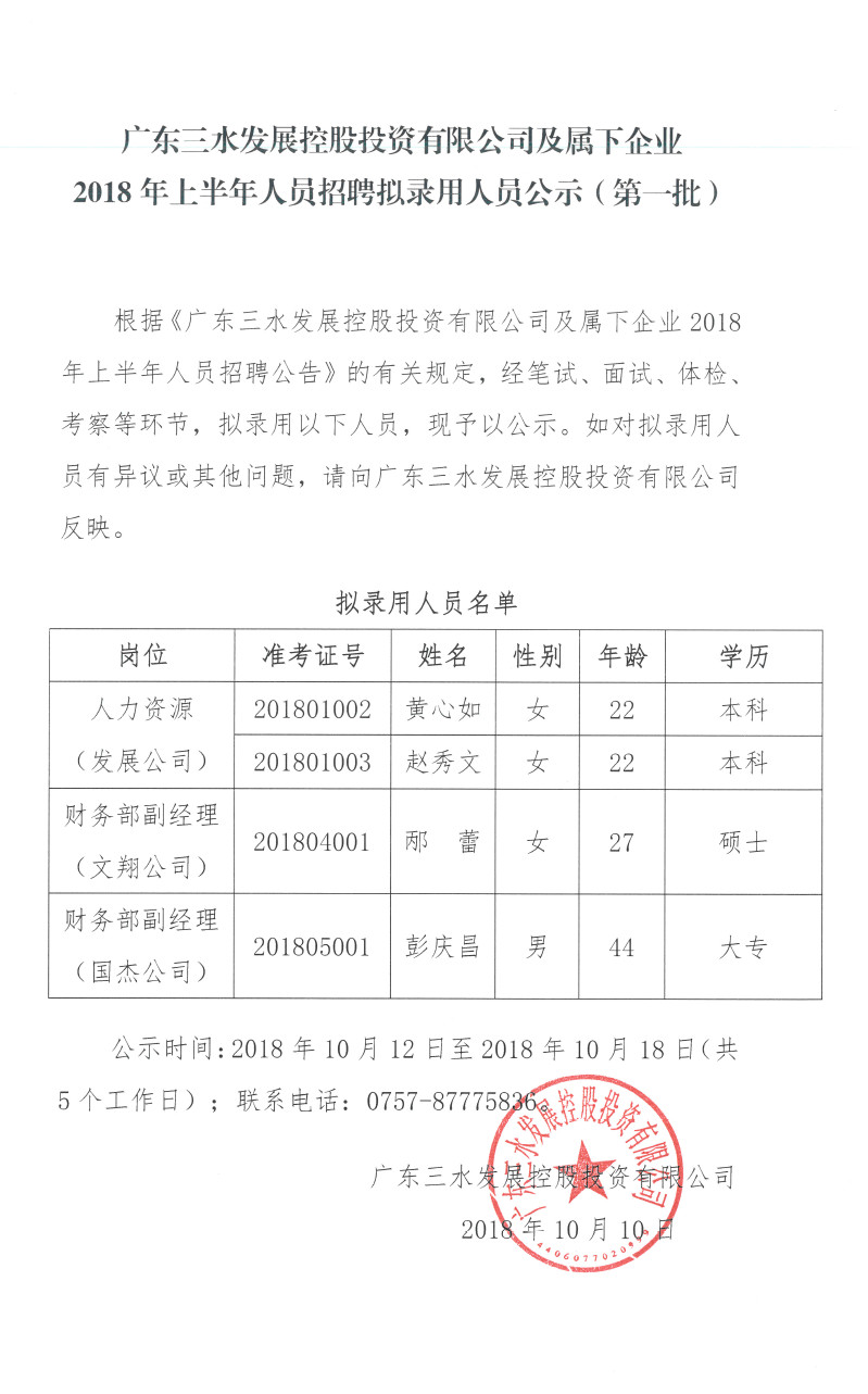 广东球盟会qmh控股投资有限公司及属下企业2018年上半年人员招聘拟录用人员公示(第一批)