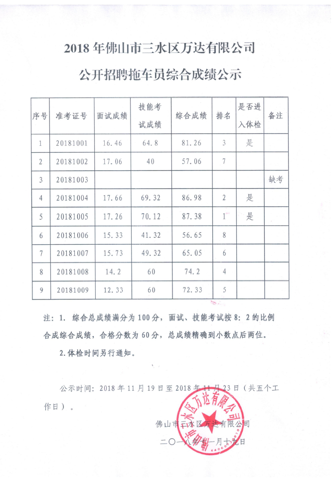 佛山市三水区万达有限公司公开招聘拖车员综合成绩公示