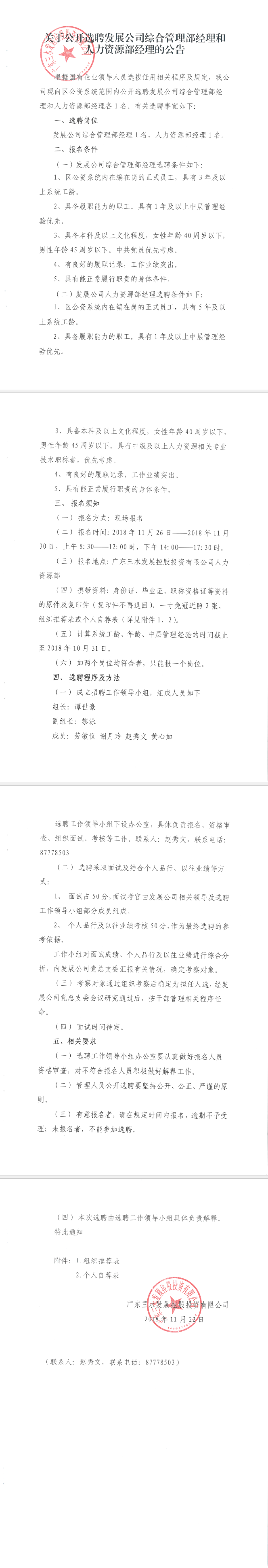 关于公开选聘发展公司综合管理部经理和人力资源部经理的公告