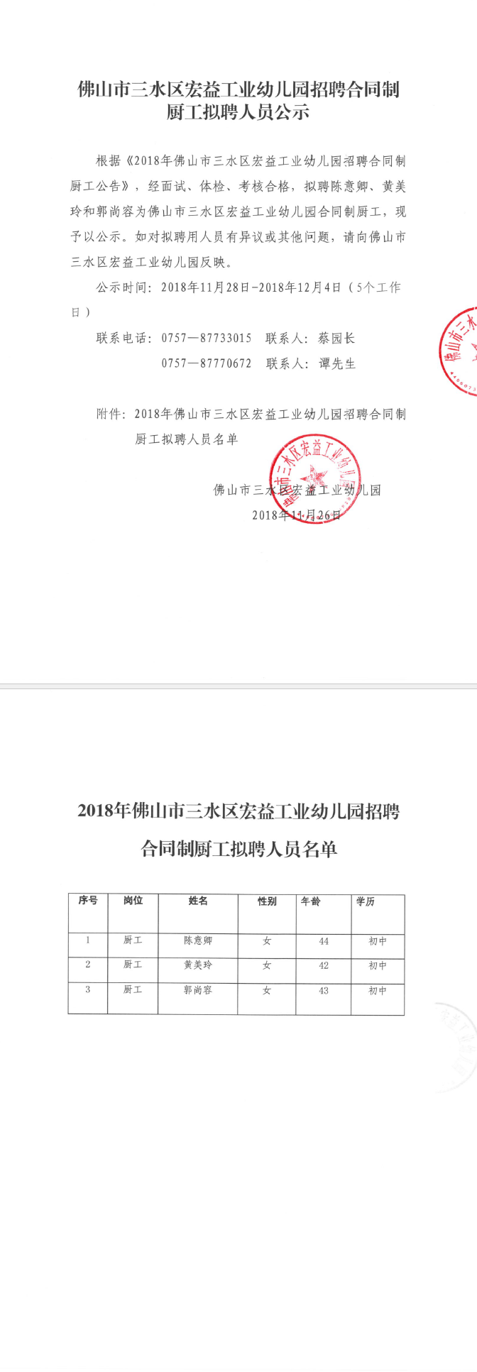 佛山市三水区宏益工业幼儿园招聘合同制教职员工拟聘人员公示