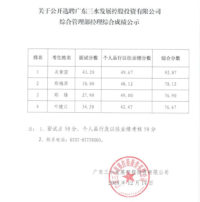 关于公开选聘广东球盟会qmh控股投资有限公司综合管理部经理综合成绩公示