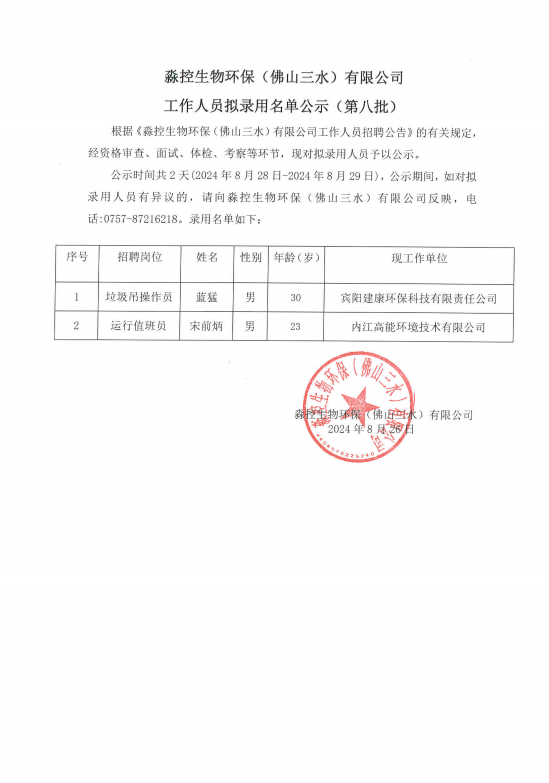 淼控生物环保(佛山三水)有限公司工作人员拟录用名单公示(第八批)