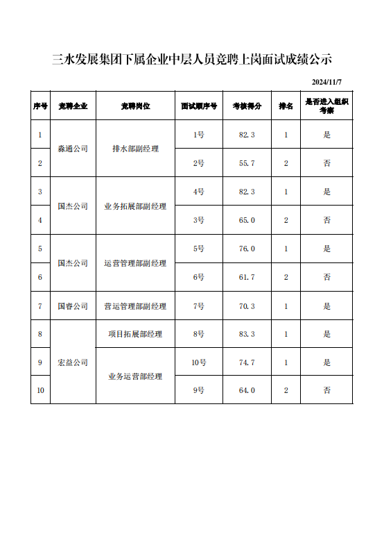 球盟会qmh集团下属企业中层人员竞聘上岗面试成绩公示
